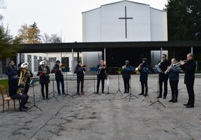 Feierlich legten Abordnungen des Volksbunds Deutscher Kriegsgräberfürsorge, der Traditionsgemeinschaft JaboG 34 und Fliegerhorst Memmingen, des Sozialverbands VdK und der Stadt Memmingen am Mahnmal auf dem Waldfriedhof Kränze nieder. Musikalisch wurde die Gedenkfeier von dem Bläserensemble der Stadtkapelle der Stadt Memmingen gestaltet.