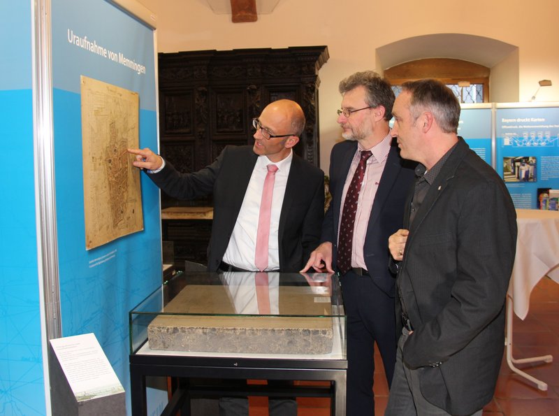 Eine Einführung in die Ausstellung gab Manfred Popp, Leiter der Pressestelle des Landesamtes für Digitalisierung, Breitband und Vermessung. "Jeder einzelne Stein wurde in Spiegelschrift von Hand millimetergenau graviert. Alle Häuser, Grundstücksgrenzen, Straßen und topographische Elemente wie Bäume sind bis ins feinste Detail dargestellt", erklärte Popp. Die Kalksteinplatten seien damals aus Solnhofen im Altmühltal gekommen. Ausgehend von der Geburtsstunde der Landesvermessung im 19. Jahrhundert, dem ersten Steuerkataster und dem Kartendruck im Lithografiesteindruckverfahren zeige die Ausstellung anschaulich die technischen Revolutionen bei der Landesvermessung bis zur heutigen Digitalisierungsstrategie des Freistaats, so Manfred Popp.