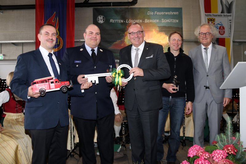 Es war ein feierlicher Moment, als ein symbolischer Schlüssel für das neue Feuerwehrhaus Amendingen aus der Hand des Architekten, Prof. Dr. Josef Schwarz, an Oberbürgermeister Manfred Schilder gereicht wurde und dieser ihn an Florian Roese übergab, Kommandant der Freiwilligen Feuerwehr Amendingen. „Ein geschichtsträchtiger Tag für die Feuerwehr Amendingen“, beschrieb Roese bei der feierlichen Einweihung des neuen Feuerwehrhauses vor rund 250 geladenen Gästen. „Lange wurde dieses Gebäude erwartet“, erklärte Oberbürgermeister Manfred Schilder. „Durch die Zusammenarbeit von vielen Seiten kam es zu einem hervorragenden Ergebnis. Nun können wir dieses neue, prächtige Feuerwehrhaus offiziell seiner Nutzung übergeben.“ Herzliche Glückwünsche sprach auch Bürgermeisterin Margareta Böckh in der Begrüßung aus.