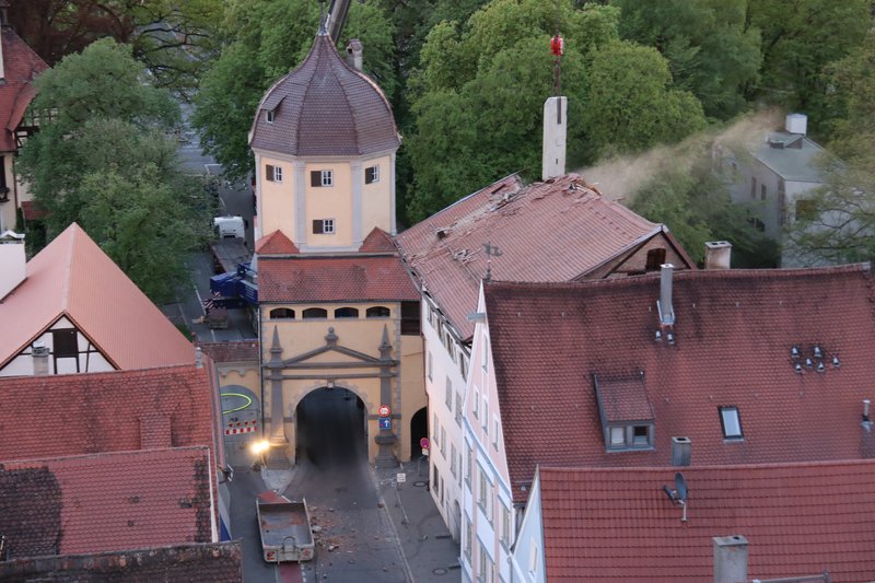 Die Notsicherung des einsturzgefährdeten Dachstuhls des denkmalgeschützten Gebäudes Zangmeisterstraße 26 ist gelungen. Mithilfe eines Autokrans und einer Abrissplatte konnte der schräg stehende Kamin entfernt und der Dachstuhl entlastet werden. Die Führungsgruppe Katastrophenschutz unter der Leitung von Oberbürgermeister Manfred Schilder, Baufachleute sowie mehr als 150 Kräfte von Rettungsdiensten, Feuerwehren, Polizei und THW waren im weiträumig abgesperrten Gefahrenbereich im Einsatz.