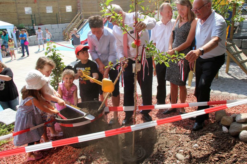 „Es ist großartig gelungen, die Interessen des Amtsgerichts und des Kindergartens unter einen Hut zu bringen“, erklärte Oberbürgermeister Dr. Ivo Holzinger. „Das ist nicht selbstverständlich.“ Er dankte dem Staatlichen Bauamt für die gute Zusammenarbeit und dem Elternbeirat für sein Engagement, gemeinsam mit der Stadt einen Kletterturm zu finanzieren. Viele Kuchen wurden von den Eltern gebacken und verkauft zugunsten des neuen Spielgeräts. Als Geschenk der Stadt brachte der Oberbürgermeister einen Apfelbaum mit, den er gemeinsam mit begeistert schaufelnden Kindergartenkindern pflanzte.