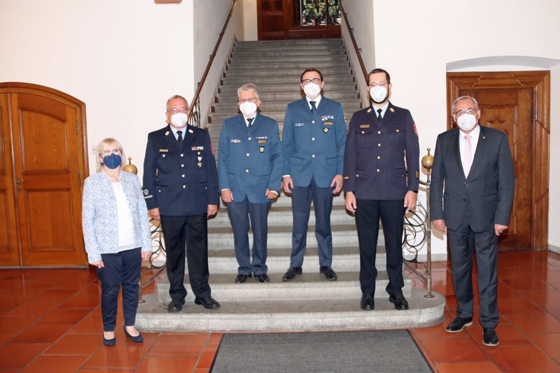 Egal ob Brände, Sturm, Hochwasser oder Schneechaos – in Krisensituationen bewahrten Dr. Günther Bachfischer (Feuerwehr Memmingen) und Wolfgang Zettler (Technisches Hilfswerk Memmingen) immer den Überblick und koordinierten die Einsätze. 21 Jahre lang wirkten sie als Örtliche Einsatzleiter im Katastrophenschutz der Stadt Memmingen. Nun wurden sie bei einer Feierstunde im Rathaus von Oberbürgermeister Manfred Schilder verabschiedet und mit Stadtbrandrat Raphael Niggl und Stephan Zettler ihre Nachfolger eingeführt.