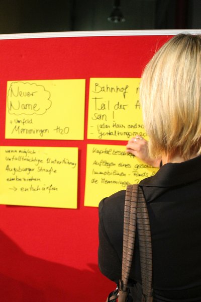 Im Anschluss gab es eine kurze Runde mit Fragen an die Anwesenden. So konnte das Team der Planer sehen, wer sich weshalb mit dem Thema Neues Bahnhofsareal beschäftigt und ein erstes Stimmungsbild wurde erstellt. In einer anschließenden Brainstorming Runde waren die Bürgerinnen und Bürger aufgefordert den Planern, dem Stadtrat und der Verwaltung noch Ideen auf den Weg geben. Dabei gab es zum Beispiel die Anregung einen neuen Namen für das Areal zu suchen. Die Sorge um den Ensembleschutz in der Altstadt wurde geäußert. Auch nachhaltiges Bauen zu fördern sowie moderne Energiestandards nicht zu vergessen wurde angemahnt. Die umliegende Bebauung und den Verkehr besser in den Planungen zu berücksichtigen war ebenfalls einer der Wünsche.