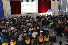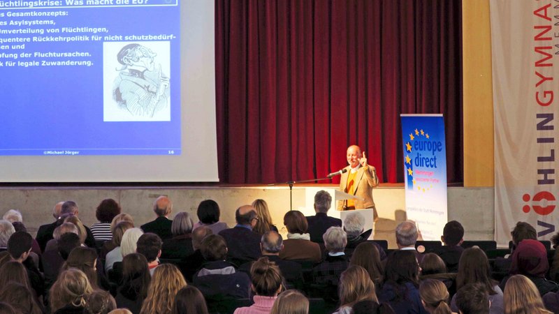 Das Europabüro der Stadt Memmingen lud zu einer schulübergreifenden Veranstaltung zum dem aktuellen Thema: „Hin zu einer neuen Migrationspolitik – Maßnahmen der EU-Kommission“ ein. Vor der mit 400 Schülerinnen und Schülern voll besetzten Aula des Vöhlin-Gymnasiums referierte dazu Dipl. Pol. Michael Jörger, Mitglied im Rednerdienst Team Europe der Europäischen Kommission und Lehrbeauftragter an der Hochschule München.
