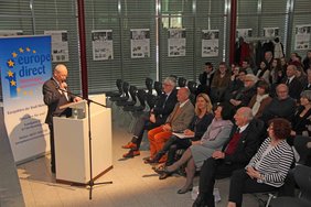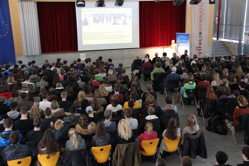 Burkhard Arnold, der Schulleiter des Vöhlin-Gymnasiums und Gastgeber, verwies in seinem Grußwort auf die hohe Aktualität des Themas und wünschte sich ein lösungsorientiertes Denken, welches den humanitären Bedürfnissen gerecht wird. Er dankte der Leiterin des städtischen Europabüros, Alexandra Störl, für die vorbildliche Zusammenarbeit. Sein ausdrücklicher, herzlicher Dank ging auch an Oberbürgermeister Dr. Ivo Holzinger, der in „seinem knappen Zeitbudget immer ein offenes Ohr für den Europäischen Gedanken hat und die Schule in ihrem Bildungsauftrag persönlich unterstützt.“
