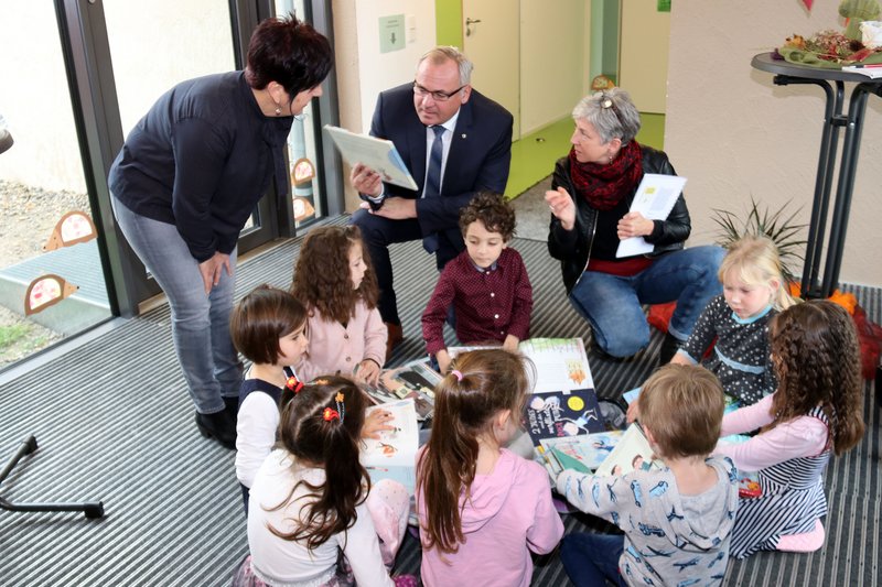 Unter den Büchern sind beispielsweise Bände der Reihe „Little People, BIG DREAMS“ mit kindgerechten Lebensbeschreibungen von Coco Chanel oder Stephen Hawking. Genau diese Biographie hat sich der kleine Jonas geschnappt und erklärte dem Oberbürgermeister, dass auch er Wissenschaftler werden möchte. OB Schilder selbst vertiefte sich in „Sigurd und die starken Frauen“, eine etwas andere Wikingergeschichte rund um Freya, eine mächtige Kriegerin und ihren schimpfenden Mann Sigurd, der sich beschwert, dass er zu Hause hocken muss, um den Stall auszumisten und die Kinder zu hüten, während die Frauen auf Beutezug fahren. Die Wikingerinnen und Wikinger diskutieren und finden eine gute Lösung: Wer von ihnen lieber kämpft, geht auf Fahrt, wer gerne das Feld bestellt, bleibt im Dorf - egal ob Mann oder Frau, auf die Persönlichkeit kommt es an.