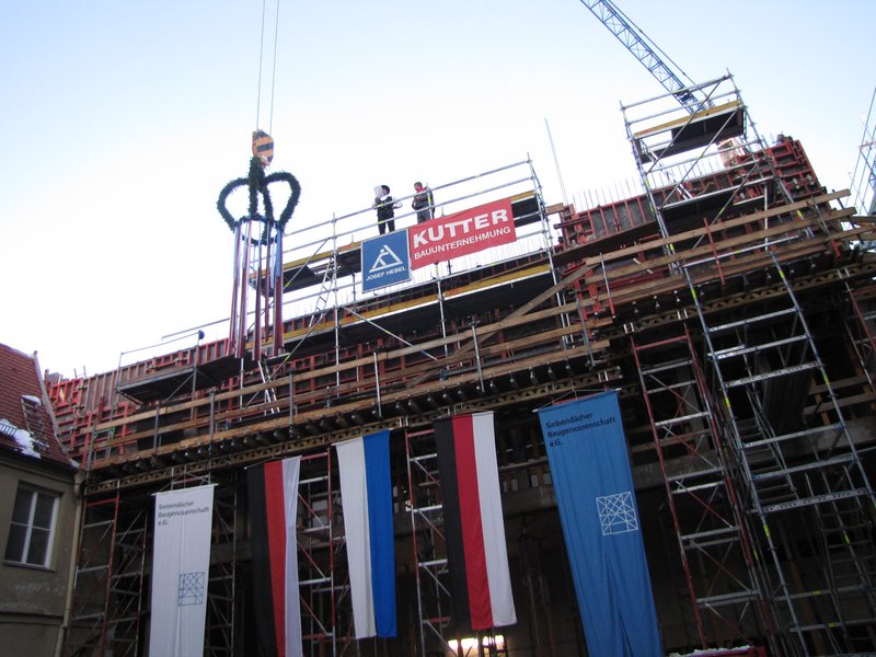 "Das ist ein historischer Tag für die Stadtentwicklung und eine historische Stunde in der fast 1000-jährigen Geschichte unserer Stadt", so Oberbürgermeister Dr. Ivo Holzinger zum Richtfest des derzeit größten Bauprojektes der Stadt, dem Neubau von Geschäftshäusern und Theaterwerkstätten um den Schrannenplatz (els Areal). Knapp 300 Gäste schauten dem Hebauf im Elsbethenhof zu, bevor es im Gebäudeinneren, dem 1. Obergeschoss des künftigen C&A in Memmingen, weiterging. Dort dankte Josef Martin Lang, Vorstand der Siebendächer-Baugenossenschaft und Bauherr des Geschäftshauses, Planern wie am Bau beteiligten Handwerkern für das bislang gute Gelingen des nicht nur zeitlich ehrgeizigen Projektes. Von einem "Leuchtturmprojekt" sprach Roland Filippi als Vertreter der Arbeitsgemeinschaft der Baufirmen Kutter und Hebel. Eröffnung des Areals mit umgestaltetem Schrannenplatz soll am 10.10.2010 sein.