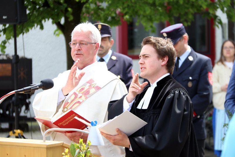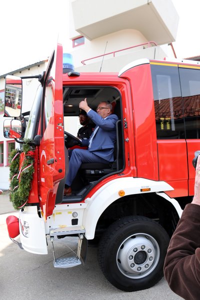 An Stadtbrandrat Raphael Niggl, Kommandant der FF Memmingen, überreichte der Oberbürgermeister neben einem großen symbolischen Schlüssel auch die Fahrzeugschlüssel mit zwei Anhängern, einem Herzen und einem Engel. „Das Herz steht für das Herz, das ihr für Menschen in Not zeigt, und dafür, dass die Stadt Memmingen hinter euch steht. Der Engel steht für Schutz. Möget ihr immer unverletzt von den Einsätzen mit diesem Fahrzeug nach Hause kommen.“ Der katholische Diakon Roland Pressl und der evangelische Pfarrer Severin Brodersen segneten das neue HLF feierlich und sprachen auch Segenswünsche aus für die Einsatzkräfte und für die Menschen, die Hilfe und Rettung erfahren werden.