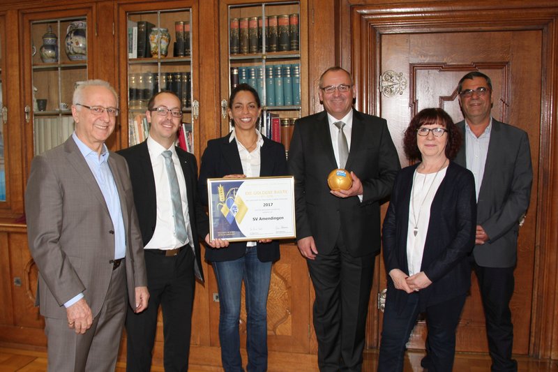 Im Beisein von Bürgermeisterin Margareta Böckh gratulierte Oberbürgermeister Manfred Schilder dem Vorstand des SV Amendingen zur Auszeichnung durch den Bayerischen Fußball-Verband mit der "Goldenen Raute mit Ähre". "Der SV Amendingen ist der erste Verein in Memmingen, der dieses Gütesiegel des BFV erreicht hat", hob Schilder hervor. Die Auszeichnung zeuge von der "tollen Arbeit, die beim SVA im Kinder- und Jugendbereich, aber auch im Erwachsenenbereich geleistet wird".