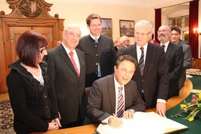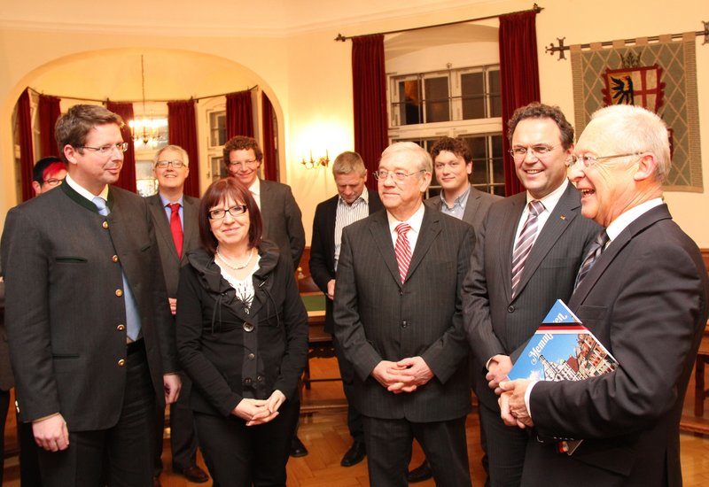 „Wir freuen uns, dass Sie hier sind“. Mit diesen Worten begrüßt Oberbürgermeister Dr. Ivo Holzinger mit Bundesinnenminister Dr. Hans-Peter Friedrich einen hochrangigen Gast aus der Bundespolitik im Memminger Rathaus. Die Bürgermeister und Fraktionsvorsitzenden des Stadtrates sowie die heimischen Abgeordneten erweisen bei einem Empfang im Sitzungssaal des Rathauses dem Kabinettsmitglied die Ehre. Der Rathauschef stellt dem Oberfranken die Maustadt vor, die - wie sich herausstellte - dieser schon aus Kindheitstagen kennt. Als Kind verbrachte der Minister seinen ersten Urlaub in Memmingen und nahm am Zeltlager der Evangelischen Gemeindejugend teil. Nach der Eintragung in das Goldene Buch der Stadt spricht Dr. Friedrich am späteren Abend noch auf dem Neujahrsempfang der Memminger CSU.