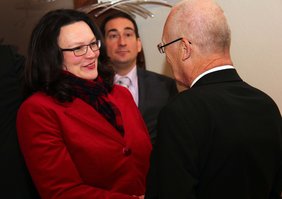Direkt im Anschluss ging es für die Generalsekretärin - von Kopf bis Fuß gekleidet in den Farben der Partei - weiter zum Politischen Aschermittwoch der Memminger Sozialdemokraten, welcher in einer gut besuchten FCM-Stadiongaststätte abgehalten wurde. Dort sprach sich Rednerin Nahles unter anderem gegen eine Privatisierung der Wasserversorgung aus.