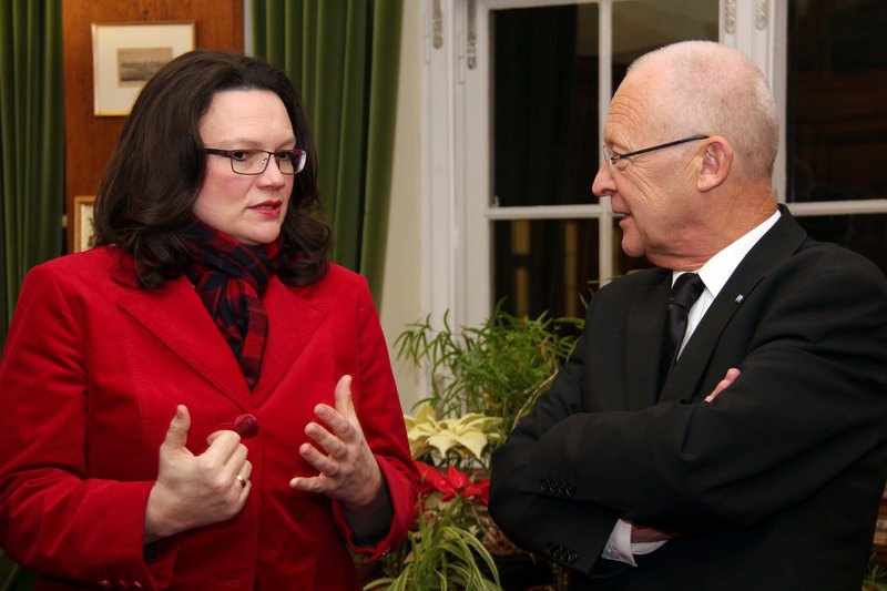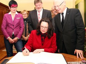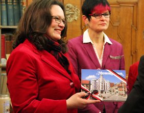 Hoher Besuch aus der Bundeshauptstadt Berlin im Memminger Rathaus: Oberbürgermeister Dr. Ivo Holzinger hat am Aschermittwoch SPD-Generalsekretärin Andrea Nahles in seinem Amtszimmer empfangen.