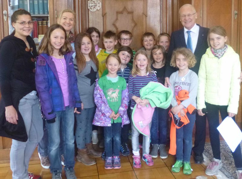 Per Handschlag begrüßte Oberbürgermeister Dr. Ivo Holzinger die Mädchen und Buben des Hortes der Kindertageseinrichtung (Kita) Eisenburg in seinem Amtszimmer. Zum Abschluss ihres Projekts „Berühmte Persönlichkeiten“ interviewten jetzt die Hortkinder den Rathauschef.