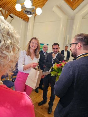 Von Memmingens Oberbürgermeister Jan Rothenbacher (ganz rechts) gab es für Gesundheitsministerin Judith Gerlach Blumen und ein Präsent.