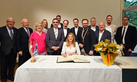 Anlässlich der 101. Jahrestagung der Vereinigung der Bayerischen Chirurgie, die noch bis Freitag, 12. Juli, in der Memminger Stadthalle abgehalten wird, hat sich die Bayerische Staatsministerin für Gesundheit, Pflege und Prävention, Judith Gerlach, im Beisein zahlreicher Vertreter von Stadt und Klinikum in das Goldene Buch der Stadt eingetragen. Bei der Tagung mit über 600 Teilnehmenden, die derzeit erstmalig im Allgäu stattfindet und unter dem Motto „Zukunft – Innovative Chirurgie“ steht, finden zahlreiche Fachvorträge hochrangiger Experten, praxisnahe Workshops und Seminare statt. Dabei geht es unter anderem um die aktive Weiterentwicklung der modernen Chirurgie im gegenwärtigen digitalen Zeitalter.