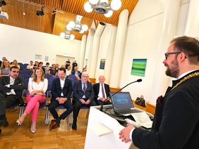 Vorstand Maximilian Mai vom Klinikum Memmingen appellierte an die Zuhörenden, „trotz Krisen positiv nach vorne zu schauen und mit innovativen Ideen die Zukunft zu gestalten.“ Memmingens Oberbürgermeister Jan Rothenbacher erwähnte in diesem Zusammenhang den geplanten Klinikneubau am Memminger Autobahnkreuz, der derzeit das größte nicht-universitäre Krankenhausprojekt in ganz Bayern darstellt.