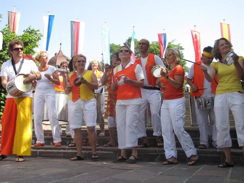 Mittlerweile bildeten sich lang Schlangen an den Verpflegungsständen der Nationen und die spanische Paella war bald ausverkauft. Auch der portugiesische Salada de Polvo – ein Oktupussalat – war der Renner. Manche Gäste vermuteten, dass hier der „Orakel-Krake Paul“ der Fußballweltmeisterschaft verarbeitet wurde. Döner, Pizza, Griechische Spieße – für jeden Gaumen war etwas geboten.