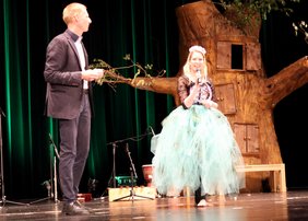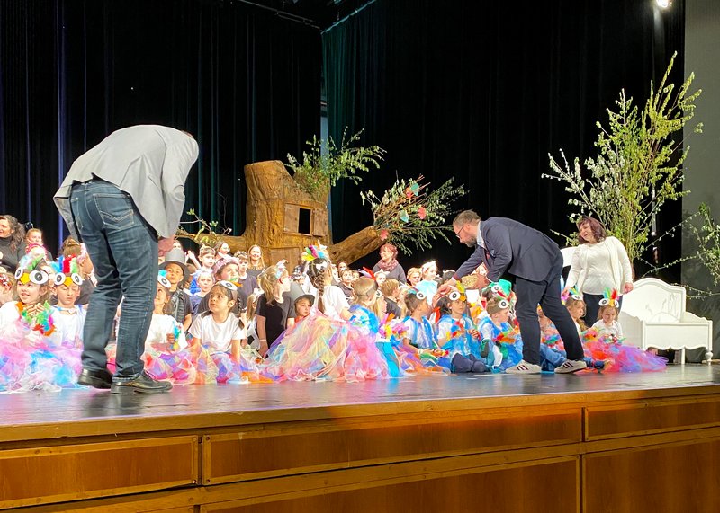 Auch Oberbürgermeister Jan Rothenbacher ließ es sich nicht nehmen, die Kinder und das Publikum zu begrüßen. Im Anschluss an die Aufführung verteilte er gemeinsam mit Marcus Geske (Incoming Präsident Rotary-Clubs MM) an alle Akteure kleine Vögel als Abschlussgeschenke.