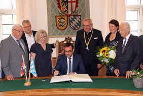 Seit Anfang 2021 ist MdL Klaus Holetschek Bayerischer Staatsminister für Gesundheit und Pflege. Bei einer Feierstunde im Rathaus trug sich Staatsminister Holetschek nun ins Goldene Buch der Stadt ein, nachdem die Feierstunde wegen dringenderer Termine bereits mehrmals verschoben werden musste. „Du zeigst großes Format im Ministeramt und machst einen tollen Job in München“, würdigte Oberbürgermeister Manfred Schilder und dankte dem Staatsminister für dessen Einsatz im Kabinett für die Heimatregion. „Ich erinnere hier ganz besonders an die Entscheidung im Ministerrat, den Klinikneubau ins Krankenhausbauprogram aufzunehmen“, betonte der Oberbürgermeister.