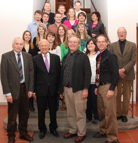 Die Studentinnen und Studenten der Universität Cape Girardeau, Missouri/USA zusammen mit dem Schulleiter der FOS/BOS Edwin Kunz, Oberbürgermeister Dr. Ivo Holzinger, Prof. Dr. Dieter Jedan und Dr. Fred W. Poston sowie Gerhard Link, der 1954 die ersten Kontakte nach Cape Girardeau knüpfte. In der letzten Reihe mittig, der stellvertretende Schulleiter der FOS/BOS, Karl Albrecht, der den Austausch auf Memminger Seite organisierte (von links). Foto: Störl/Pressestelle Stadt Memmingen.