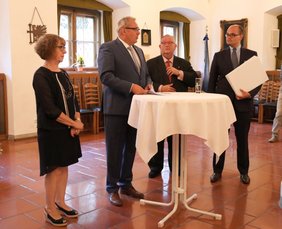 In Zusammenarbeit mit der Stadt Memmingen plant der Historische Verein Memmingen an historisch bedeutsamen Orten im Memminger Osten die Aufstellung von Stelen. Auf diesen Stelen sollen Texte zu dem jeweiligen Ort befestigt werden, um „Erinnerung zu schaffen“, wie Christoph Engelhard, 1. Vorstand, betonte. Eine Stele wird auch auf der Grünfläche des Waldfriedhofs installiert werden, mit Hinweis auf das Krematorium Memmingen. Über die Spende von 1.000 Euro für die Stelen freute sich Christoph Engelhard gemeinsam mit Bernhard Hartnig, Ausschuss-Mitglied, und Katrina Dibah-Lavorante, Stadtteilmanagerin für den Memminger Osten.
