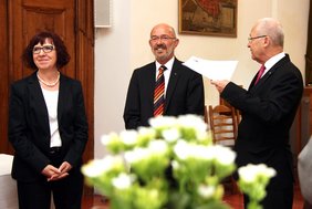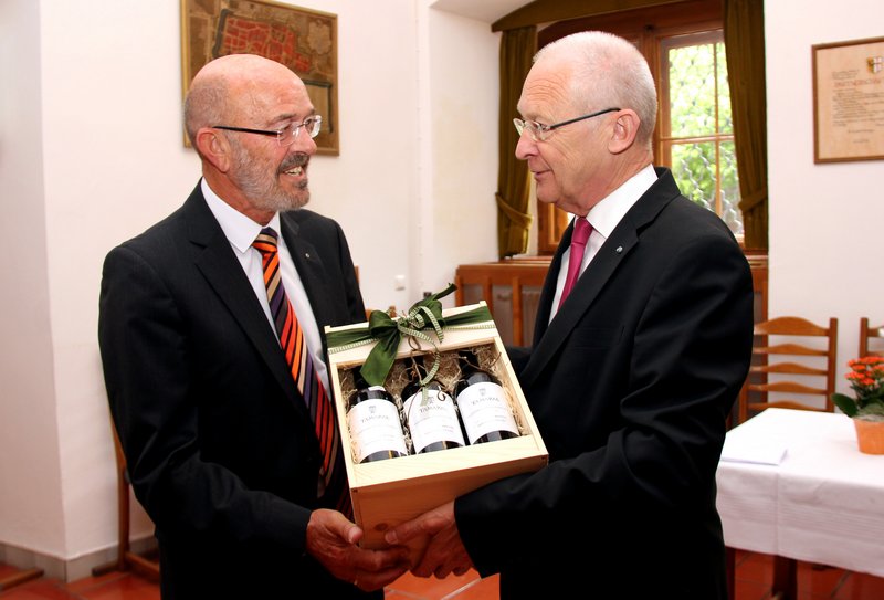 "Ein weiterer Grund ist, dass ich nicht gegen meinen Freund Werner Häring zur Wahl antreten wollte", sagt der 73-Jährige bei seiner Verabschiedung im Rathaus und wendet sich lächelnd dem neuen dritten Bürgermeister von den Sozialdemokraten zu.