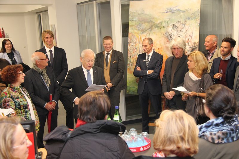 Oberbürgermeister Dr. Ivo Holzinger eröffnete in den neuen Räumlichkeiten der Sparkasse Memmingen-Lindau-Mindelheim in der Maximilianstraße im Beisein von zahlreichen Festgästen aus Kunst, Kultur, Wirtschaft und Politik den künstlerischen Stadtspaziergang. Der Spaziergang führte zu verschiedenen Exponaten in der Memminger Altstadt.