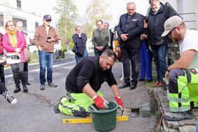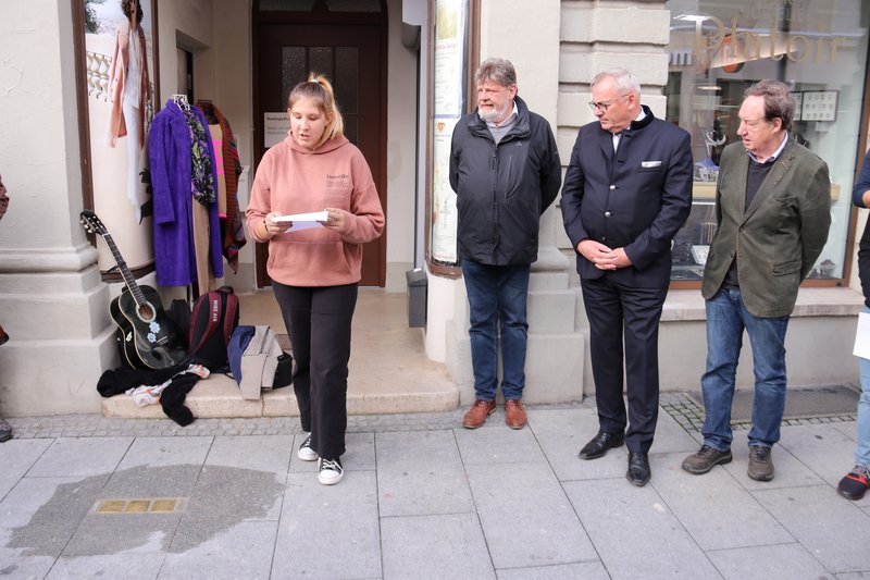 Oberbürgermeister Schilder dankte dem Verein Stolpersteine in Memmingen e.V. mit Vorsitzendem Rolf Spitz sowie den Schülerinnen und Schülern der Staatlichen Realschule, die eine Patenschaft für die Pflege der Stolpersteine übernommen haben und die Gedenkfeier mitgestalteten. Ein Geigenensemble der Schule bot einen würdigen musikalischen Rahmen. Vorsitzender Rolf Spitz verlas die Inschrift der einzelnen Steine, bevor Mitarbeiter des städtischen Bauhofs die Steine mit Bedacht in den Boden einbrachten. Schülersprecher Joseph Kassis sowie die Zehntklässlerin Viktoria-Alexandra Schenk verlasen die Geschichte der Menschen, an die die Stolpersteine heute erinnern. Ergänzt wurde dieses Gedächtnis mit Forschungen von Heimatpflegerin Sabine Streck, die auch Erinnerungen von Zeitzeugen einbrachte.