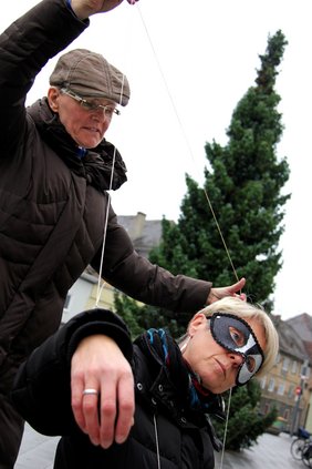 Eine junge Fußgängerin, die bereits Unterstützung vom Memminger Frauennetzwerk empfangen hat, bleibt bei den Agierenden stehen. Sie hat ihren Erzählungen zufolge am eigenen Leib erfahren, wie schwierig es ist, aus dem gewalttätigen Spiel auszubrechen. Jetzt will sie andere ermutigen, die Fäden der Fremdbestimmtheit zu durchtrennen.