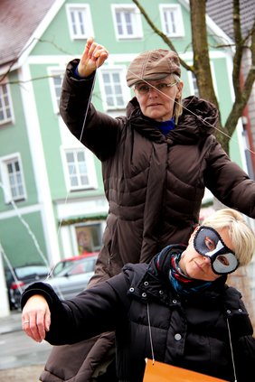Mut und Hoffnung wollen Egg und Stockner-Stengele verzweifelten Frauen schenken. Unweit des Marionettenspiels verteilen sie Visitenkarten mit einer Notrufnummer des Frauenhauses. „Meistens sind gerade die, die es betrifft, uns gegenüber am verschlossensten“, erklärt Stockner-Stengele. „Aber mit jedem verteilten Kärtchen haben wir schon etwas gewonnen.“ Und helfen damit vielleicht einer Frau aus ihrem gewaltdiktierten und fremdbestimmten Dasein.