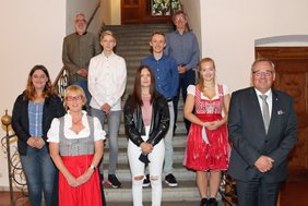 Seit zehn Jahren sind sie Mitglied bei den Trommlerbuben und wurden für ihr Engagement nun von Oberbürgermeister Manfred Schilder mit dem Mau-Anstecker geehrt: Lea Häring, Tobias Hermann, Johannes Holley, Sara Hruschka und Sarah Müller. „Die Trommlerbuben haben mir heuer wirklich gefehlt“, sagte der Oberbürgermeister, der sonst am frühen Kinderfestmorgen von den Trommlerbuben musikalisch geweckt wird. „Für euer tolles Engagement danke ich euch sehr. Ihr seid ein wichtiger Teil unserer Heimatfeste“, betonte OB Schilder. Gerlinde Arnold, Vorsitzende des Kinderfestausschusses, sprach den Jugendlichen große Anerkennung aus für die vielen Jahre bei den Trommlerbuben.