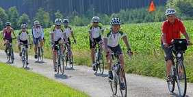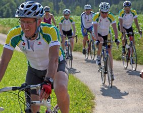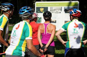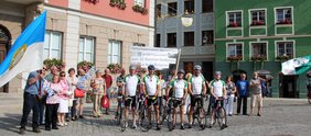 Radfahrer des Allgemeinen Deutschen Fahrrad-Clubs Memmingen-Unterallgäu (kurz ADFC) begleiteten die Fackelläufer - mit einem kurzen Stopp am Naturdenkmal „Tulpenbaumallee“ in Ferthofen - nach Memmingen, wo sie von Mitgliedern des Gehörlosenvereins Memmingen und Umland mit ihrem Vorsitzenden Robert Albrecht und ihrem Ehrenvorsitzenden Herrn Weigele schon auf dem sonnigen Marktplatz mit Banner und Fahnen erwartet wurden.