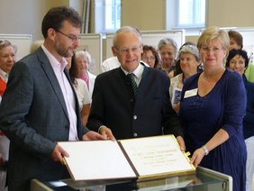 Oberbürgermeister Dr. Holzinger bedankte sich insbesondere bei Wilhelm Mändle aus Essen, der mit der Schenkung einer Fotosammlung an seine Geburtsstadt die Fotopräsentation erst möglich gemacht hat. Stadtarchivar Christoph Engelhard erläuterte die 14 Aufnahmen, die kommunale Gebäude aus der Amtszeit von Bürgermeister Julius von Roeck zeigen. Die Fotografien wurden dem damaligen Bürgermeister anlässlich seines 25-jährigen Gemeindedienstes überreicht, zusammen mit einer lederbezogenen und mit dem Stadtwappen verzierten Schatulle.