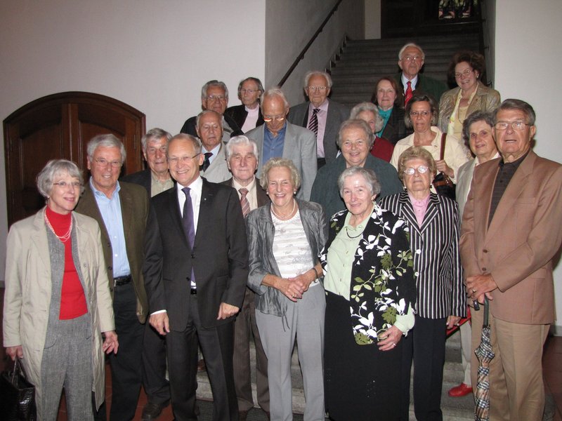Die Memmingerin Elfriede Seybold (rechts neben Oberbürgermeister Dr. Ivo Holzinger) organisiert seit Jahren ein Treffen einer Gymnasialklasse des Jahrganges 1925/1926 in ihrer ehemaligen Heimatstadt Memmingen. Ende 1944 machten alle ihr Notabitur wobei einige noch im Kriegseinsatz ihr Leben lassen mussten.
