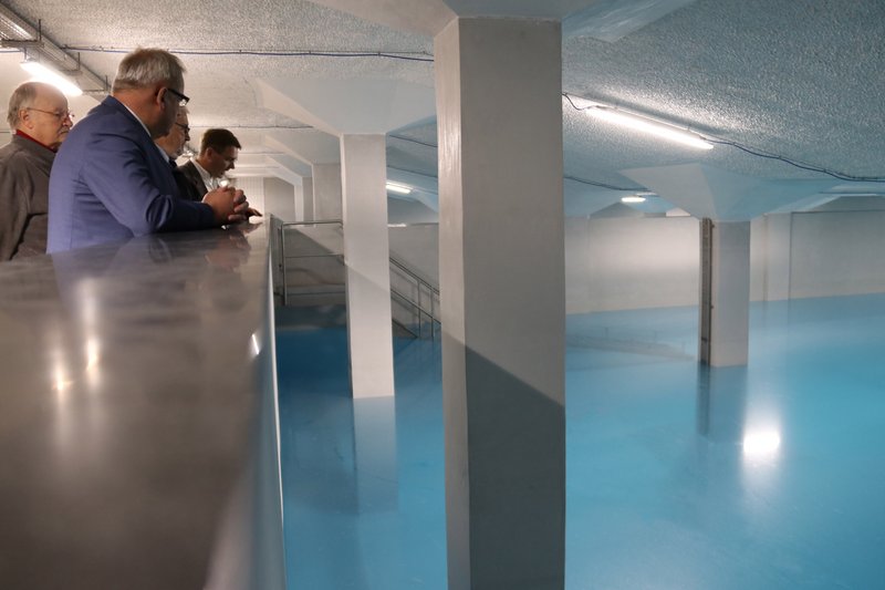 Die Sanierung des Hochbehälters lief 2015 an. „In einem ersten Bauabschnitt haben wir die Abdichtung der Gebäudehülle von außen erneuert, einen Wärmeschutz aufgebracht und das Gelände optimiert“, erläuterte Marcus Geske, Technischer Leiter der Stadtwerke Memmingen. Seit 2017 ging es im Innenraum weiter. Die alte Beschichtung musste im Wasserhöchststrahlverfahren abgetragen werden und Schicht für Schicht wurde eine neue mineralische Beschichtung aufgebaut. Drucktüren wurden eingebaut, Treppen zu den Kammern erneuert. Beleuchtung und Elektroinstallationen wurden auf den neuesten Stand gebracht und eine Sprühwasserpumpe ausgetauscht. Die Arbeiten wurden bei laufendem Betrieb ausgeführt, eine Kammer war immer am Netz. „Es gab natürlich auch besondere hygienische Auflagen und alle Materialien müssen für die Verwendung im Trinkwasserbereich zugelassen sein. Die Kabelisolierung ist beispielsweise auf der Basis von Neopren, die neue Mineralbeschichtung ohne organische Inhaltsstoffe“, erläuterte Marcus Geske.