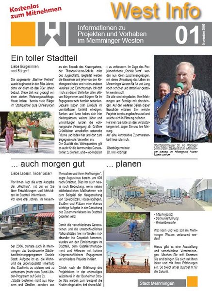 In den nächsten Tagen erhalten die Haushalte im Memminger Westen die erste Ausgabe der „West Info“ – ein Blatt, das über die Projekte und Vorhaben im Memminger Westen informiert. Außerdem liegt die „West Info“ an zentralen Stellen des Stadtteils aus und kann kostenlos mitgenommen werden.