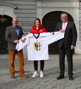Neue Trikots mit dem Wappen der Stadt Memmingen werden die Damen des Eishockey-Bundesligisten des ECDC Memmingen ab sofort beim Training, zum Aufwärmen vor den Spielen und bei öffentlichen Terminen tragen. Kapitänin Daria Gleißner übergab Oberbürgermeister Manfred Schilder und Stadtkämmerer Gunther Füßle eines der Trikots, auf denen der Adler und das Kreuz nun an prominenter Stelle prangen. Auf der Rückseite sind die Logos des Club 20, der Sponsoren der Mannschaft, zu sehen. Gleißner bedankte sich bei der Stadt für den Zuschuss zu den neuen Trainingstrikots, die die Damen nun deutschlandweit tragen werden. Oberbürgermeister Manfred Schilder wünschte der Mannschaftskapitänin und Nationalspielerin sowie dem gesamten Team viel Erfolg in der neuen Saison.