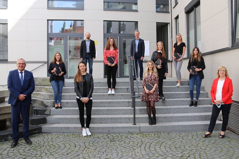 Die Ausbildung als Kauffrau für Büromanagement hat Madeline Anger mit einer Note von 1,5 abgeschlossen. Sie arbeitet im Bauverwaltungsamt. Annelie Dreier schloss ihre Ausbildung zur Kauffrau für Büromanagement mit 1,0 ab, sie arbeitet im Einwohnermeldeamt. Tabea Fechner schloss die Ausbildung zur Kauffrau für Büromanagement mit 1,7 ab, sie arbeitet im Personalamt. Im Ausländeramt ist Hannah Reffler tätig, die ihre Ausbildung zur Kauffrau für Büromanagement mit 1,5 abgeschlossen hat. Bei der Verkehrsüberwachung arbeitet Michaela Wassermann, die ihre Ausbildung zur Kauffrau für Büromanagement mit 1,0 abgeschlossen hat. Die Traumnote von 1,0 hat auch Melanie Epple bei ihrer Ausbildung als Altenpflegerin erzielt, sie arbeitet im Bürgerstift. Nadine Schmidle arbeitet im Jobcenter und schloss den Beschäftigtenlehrgang I mit 1,8 ab. Den Beschäftigtenlehrgang II schloss Corinna Jonetz mit 1,9 ab, sie arbeitet im Jugendamt.