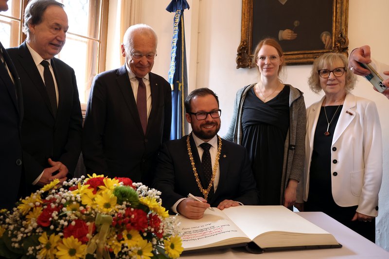 Oberbürgermeister Jan Rothenbacher trug sich gemeinsam mit seiner Frau Ariana ins Goldene Buch der Stadt ein. Auch die Bürgerschaft war zur Amtseinführung eingeladen. Viele Memmingerinnen und Memminger nahmen die Chance wahr und die Rathaushalle war bis zum letzten Platz gefüllt.