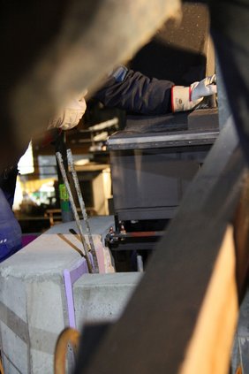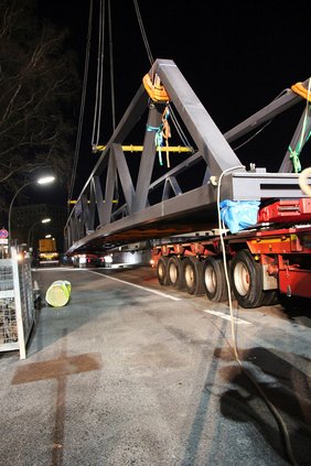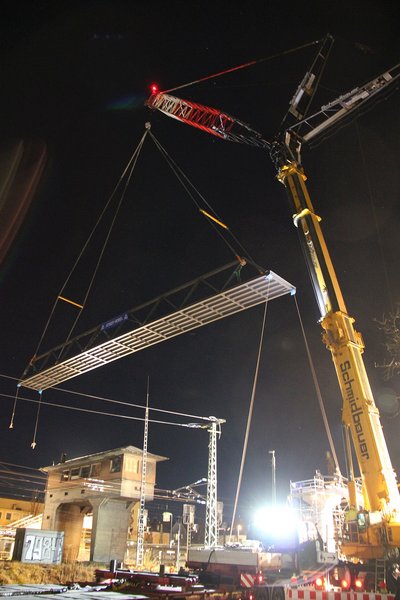 In der Gaswerkstraße wurde die Brücke mit ihren 38 Tonnen dann vorsichtig an den vorbereiteten Schwerlastkran gehängt, der sie über die am Bahnhof vorhandenen Leitungen und das alte Stellwerk millimetergenau in die vorbereiteten Treppenaufgänge hievte.