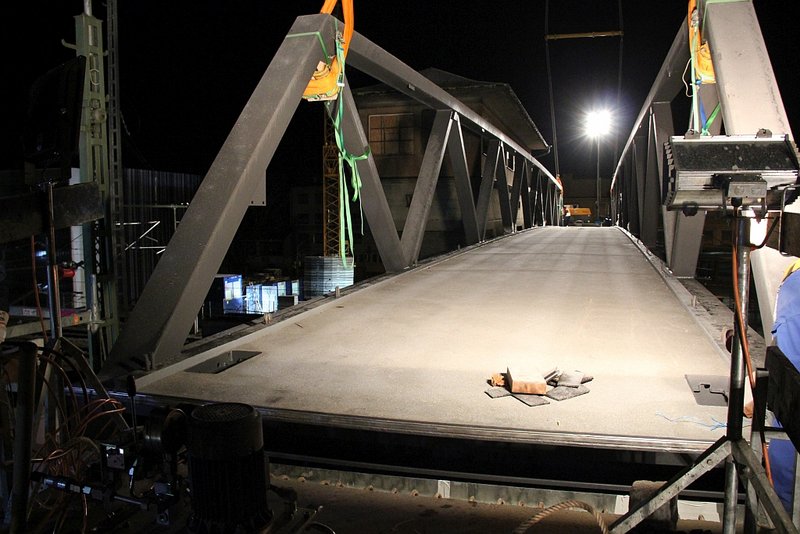 Nach nicht ganz zwei Stunden war diese Aufgabe erledigt und nur die fleißigen Bauarbeiter waren die ganze Nacht lang tätig um die Brückenköpfe vorschriftsmäßig zu verankern. Bevor jedoch die ersten Fußgänger den nun 2,5 Meter breiten Weg über die Gleise nutzen können, werden wohl noch ein paar Wochen vergehen. Schließlich müssen noch Geländer und andere Sicherheitsausstattungen am gesamten Bauwerk angebracht werden. Oberbürgermeister Manfred Schilder zählte ebenfalls zu den nächtlichen Beobachtern: „Auch wenn ich so einige Kindheitserinnerungen mit dem alten Steg verbinde, bin ich mir sicher, dass die neue Brücke bei der Bevölkerung gut ankommt.“