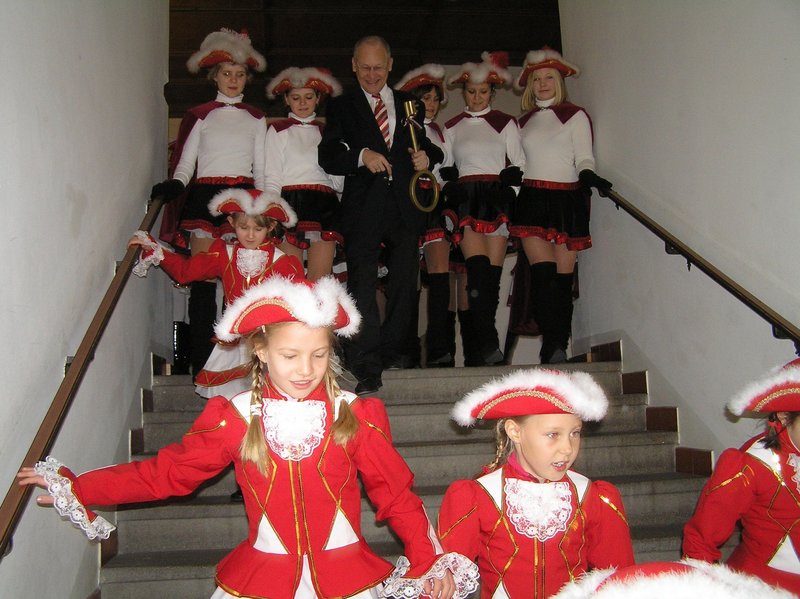 Die Narren stürmen mit langen Lanzen bewaffnet und voller Wucht gegen das Rathaustor. Kurze Zeit später schwenkt Dr. Holzinger von seinem Amtszimmer im ersten Stock eine weiße Fahne. Die Hausmeister geben ihren Widerstand auf und öffnen das Portal zum Rathaus. Stadtbachhexen und Gardemädchen voran stürmen in den ersten Stock und führen den Rathauschef nach unten. Der Oberbürgermeister übergibt symbolisch den Rathausschlüssel dem Elferrat und damit ist die Maustadt wieder fest in die Händen der Narren. Nun folgt ein kurzer Wortscharmützel zwischen dem Sprecher des 11er Rats und dem Oberbürgermeister.