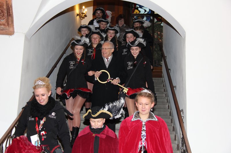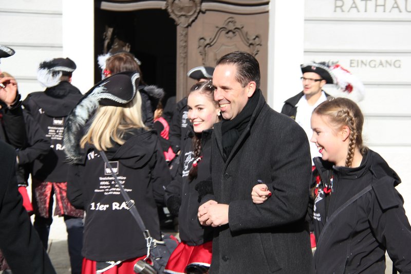 Prinzessin Ramona I. hielt den Schlüssel triumphierend in die Höhe und freute sich mit Prinz Fabian II. darüber, ab sofort die Regierungsgeschäfte zu übernehmen. Das gefiel auch dem Kinderprinzenpaar Annalena und Christoph, das den Oberbürgermeister für seinen Einsatz zugunsten der Kinder lobte und besonders die Erweiterung und Modernisierung von Kindergärten, Krippen und Schulen hervorhob. Auch das Prinzenpaar wand dem Oberbürgermeister in seiner Rede ein Kränzchen. "Eine kommunalpolitische Ära" gehe zu Ende, da das Stadtoberhaupt nach 36 Dienstjahren bald in den wohlverdienten Ruhestand eintrete. Die Narren erinnerten an einige Meilensteine in Holzingers sechs Amtsperioden und hoben seine "fröhliche, einnehmende Art" hervor. Besonderer Dank galt dem Oberbürgermeister für sein Engagement zugunsten der Fasnacht in Memmingen.