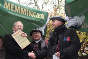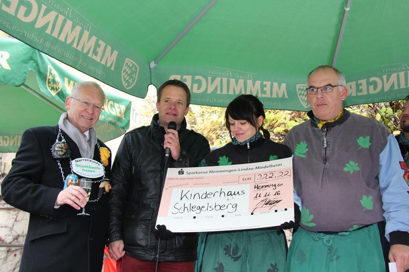 Die Stadtbachhexen mit Vorsitzendem Rainer Betz nahmen den Rathaussturm zum Anlass, dem Leiter von Sankt Hildegard, Andreas Göster, einen Spendenscheck in Höhe von 222,22 Euro für das Kinderhaus Schlegelsberg zu überreichen. Ebenfalls über einen Scheck in Höhe von 222,22 Euro durfte sich die Igelstation Memmingen freuen.