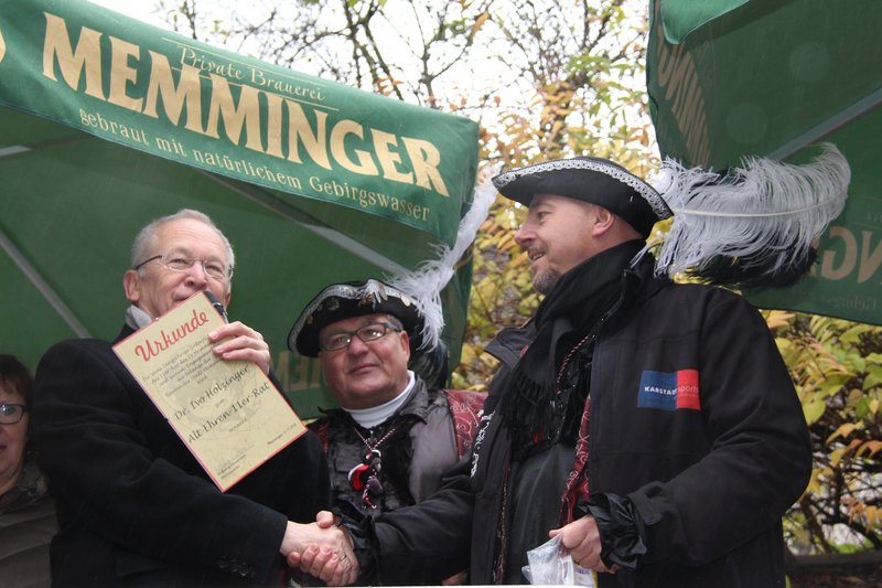 Eine weitere Auszeichnung wurde Holzinger nun beim Rathaussturm zuteil: Moderator Joachim Kehrle gab unter großem Applaus des Publikums bekannt, dass dem scheidenden Stadtoberhaupt hiermit der Titel und die Urkunde "Alt-Ehren-Elferrat" verliehen werde. Darüber hinaus benannten die Narren kurzerhand den Marktplatz in "Dr. Ivo Holzinger Platz" um.