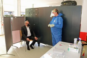 Geführt von Tobias Weimer, Leiter des DLRG-Testzentrums, besichtigte OB Schilder die Teststrecke von der Anmeldung über die Abstrichstelle bis zum Wartebereich und lies sich auch selbst testen. „Die Teststation ist ganz hervorragend professionell organisiert“, zeigte sich der Oberbürgermeister beeindruckt. Über 40 Ehrenamtliche haben sich nach einem Aufruf von Anton Wiedergrün, der das Personal der Teststation organisiert, zur Mitarbeit in der Schnelltest-Stelle bereit erklärt. Sie erhielten eine Schulung durch Dr. Jan Henrik Sperling, ärztlicher Koordinator für Corona in Memmingen. Pro Schicht arbeiten immer vier Personen zusammen. Die Teststelle ist immer mittwochs und sonntags von 17-19 Uhr geöffnet. Maximal können rund 120 Personen an einem Abend getestet werden.