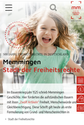 Vor 499 Jahren wurden in Memmingen die Zwölf Artikel formuliert: mehr Freiheit, mehr Mitbestimmung und mehr Gerechtigkeit lauteten die Forderungen, die bis heute brandaktuell sind. Historische Informationen modern aufbereitet, Veranstaltungen, Stadtführungen oder die Möglichkeit sich selbst in Themen einzubringen - viele Infos und Aktionen rund um die Zwölf Artikel und die „Stadt der Freiheitsrechte“ finden Interessierte ab sofort auf der neuen Website www.stadt-der-freiheitsrechte.de