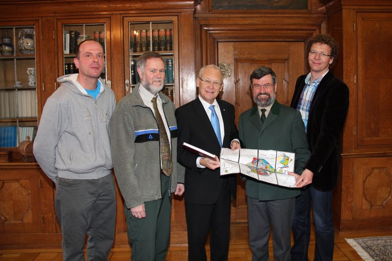 Oberbürgermeister Dr. Ivo Holzinger hat in seinem Amtszimmer gemeinsam mit dem Leitenden Forstdirektor Rainer Nützel und Stadtförster Georg Jutz den neuen Forstwirtschaftsplan für das Memminger Waldgebiet "Brunnen" vorgestellt. Anhand einer aktuellen Bestandsaufnahme gibt der Plan die "Spielregeln" vor, nach denen in den kommenden 20 Jahren die 77 Hektar große Waldfläche bewirtschaftet werden soll.