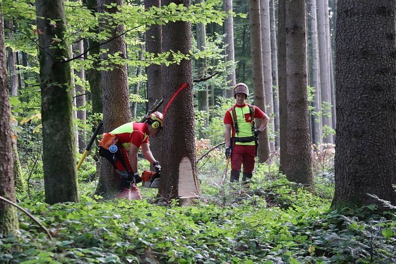 Zum Abschluss der Waldbegehung warteten Forstwirtschaftsmeister Florian Fink und der Auszubildende Timm Oecknick, um den Räten zu zeigen, wie man fachgerecht und sicher einen Baum fällt. Nach eingehenden Informationen zum Berufsbild Förster, der Vorstellung der Ausrüstung sowie die Belehrung zur Schnittführung bei der Fällung, fiel die Fichte dann wie gewünscht. Der Baum wurde ausgesucht, um Licht für die heranwachsenden Pflanzen zu schaffen. „Vorausschauendes Planen und dem Neuen Raum geben, das sind zwei Dinge, die uns nicht nur im Wald am Herzen liegen“, unterstrich auch Oberbürgermeister Manfred Schilder beim Termin im Grünen.