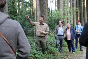 Der nächste Punkt war nicht neu, sondern ist eines der Bodendenkmäler im Memminger Forst und seine Geschichte ist älter als 800 Jahre: Die Erhebung im Bürgerwald, die allgemein als Schwedenschanze bekannt ist und auf der bereits im Jahr 1160 eine Burg errichtet wurde. Forstamtsleiter Stefan Honold nutzte den Halt um nicht nur über die historische Vergangenheit des Orts zu sprechen, sondern vor allem um die derzeitige Situation der Bepflanzung in diesem Waldgebiet zur Sprache zu bringen. Fast 85 Prozent Fichtenanteil ist dort vertreten. Ein Umstand, der zügig geändert werden sollte, da die Fichte – vor allem in Monokulturen – anfällig für Schädlinge, Stürme und Dürre ist. „Ein abwechslungsreicher Mischwald aus Laub und Nadelholz ist sehr viel resistenter und wird von uns hier auf lange Sicht angestrebt. Die Fichte werden wir nie ganz rausbekommen, da sie sich fleißig selbst vermehrt, aber wir treiben hier die Verjüngung und den naturnahen Umbau voran, mit der Pflanzung von mindestens zehn verschiedenen Baumarten und hunderten neuen Pflanzen“, erzählt Honold. Um die neuen Bäume vor dem hungrigen Wild zu schützen sei außerdem ein ausgeglichenes Wald-Wild-Verhältnis nötig oder Zäune und andere Maßnahmen gegen den Verbiss. Die Art und Weise der Bewirtschaftung erfolge integrativ: Totholz werde dann zum Teil auch liegengelassen und einzelne Bäume als Biotopbäume bleiben stehen, um für die Tiere entsprechend Platz zu bieten.